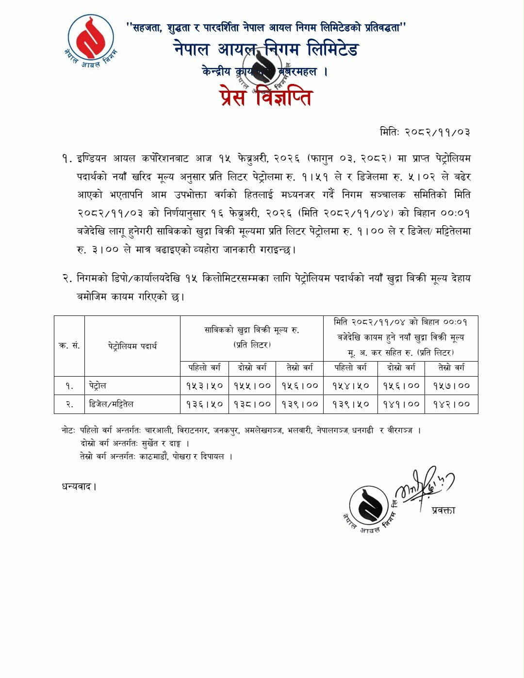 निगमले पेट्रोलको मूल्यमा १ रुपैयाँ र डिजेल/मट्टीतेलमा ३ रुपैयाँले मूल्य वृद्धि गरेको हो । नयाँ मूल्य सूची सोमबार राति १२ बजेपछि लागु हुने जनाइएको छ । इन्डियन आयल कर्पोरेशनले प्रत्येक १५ दिनमा पठाउने मूल्य सूची अनुसार नेपाल आयल निगमले मूल्य समायोजन गर्दै आएको छ ।