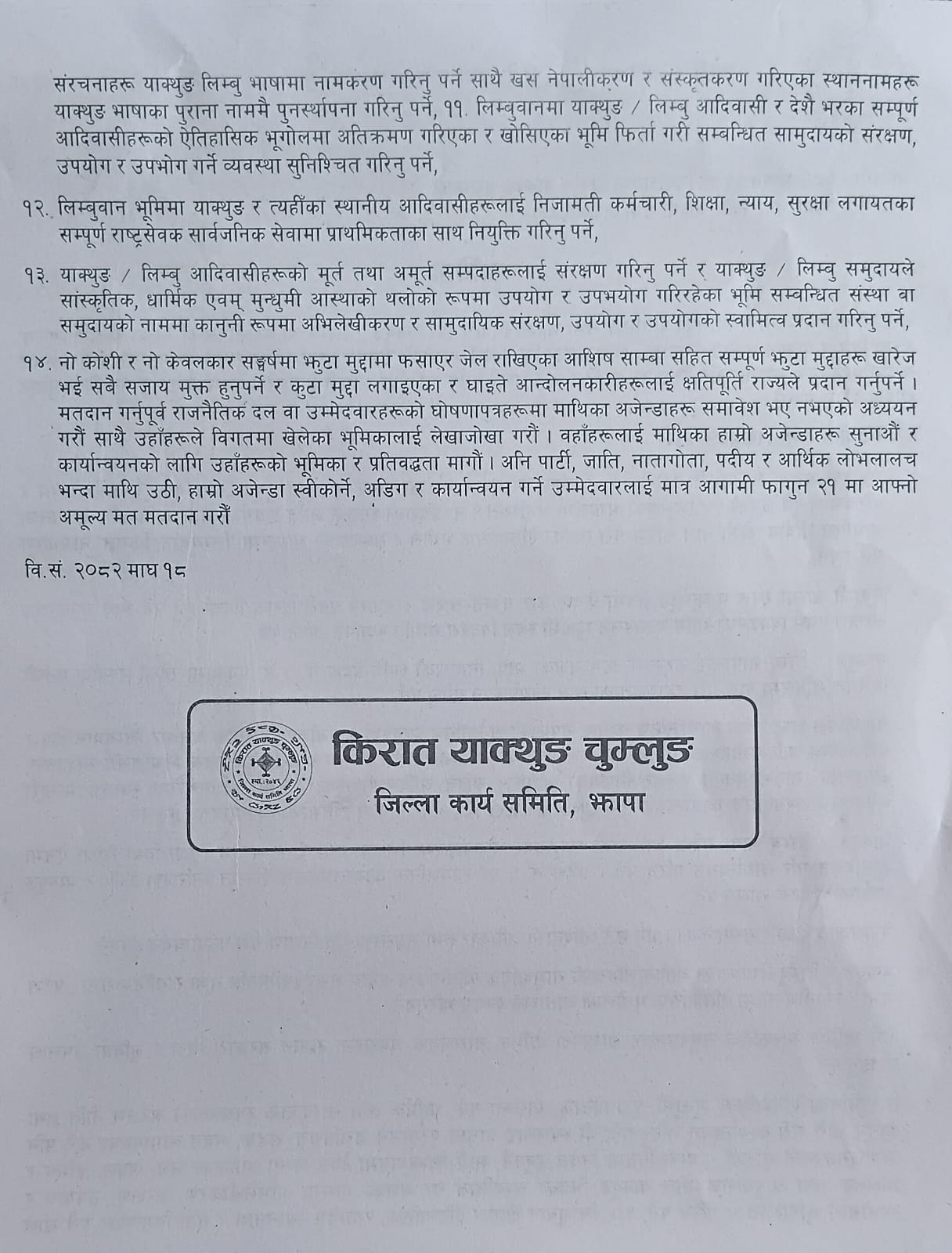 उनीहरुले आफ्नो संस्कृति र सभ्यतासँग जोडिएको मुक्कुम्लुङ संरक्षणका लागि केबलकार बन्न नहुने र कोशी प्रदेश नामाकरण खारेजी हुनु पर्ने मागसहित प्रतिबद्धताका लागि दलहरुलाई अपिल गरेका छन् । उनीहरुले विभिन्न १४ वटा माग र सवाल अघि सार्दै ‘पार्टी र जातिभन्दा माथि उठौँ, हाम्रो एजेण्डा स्वीकार्ने, अडिग र कार्यान्वयन गर्नेलाई जिताऔँ’ भन्ने अपिल गरेका छन् ।