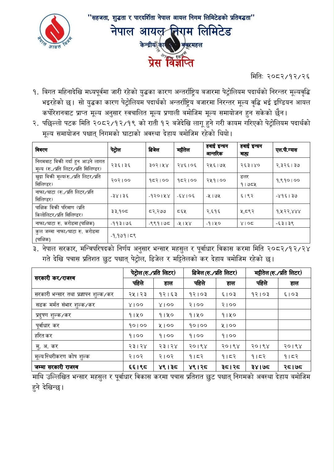 सरकारले भन्सार महसुल र पूर्वाधार विकास करमा ५० प्रतिशत छुट दिँदा पनि निगमको घाटा न्यूनीकरण नभएपछि मूल्य बढाउनु परेको विज्ञप्तिमा उल्लेख छ ।