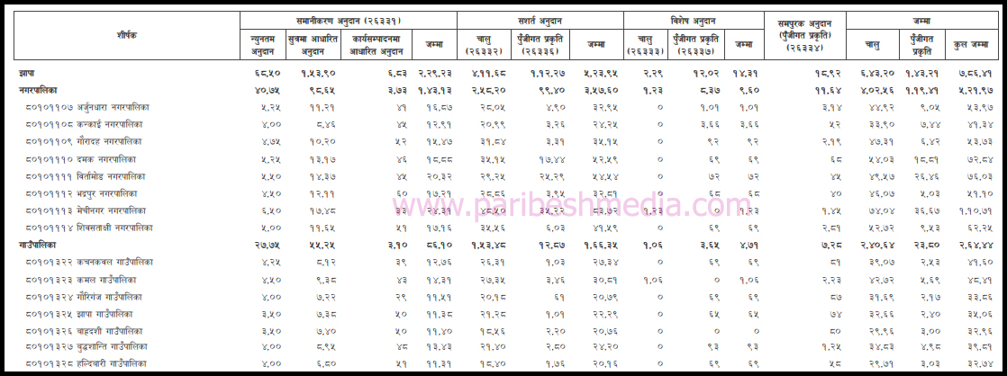 सरकारले स्थानीय तहका लागि छुट्याएको ३ खर्ब २० अर्ब २६ करोड ४६ लाख रुपैँया मध्ये २.४५ प्रतिशत झापाका पालिकाले प्राप्त गरेका हुन् ।